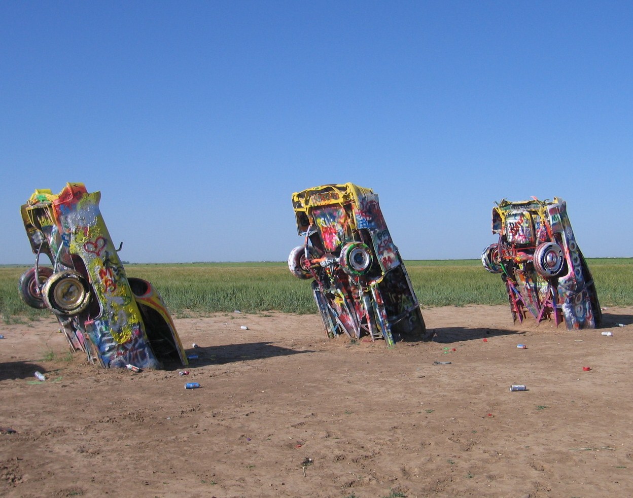 I am so tired when the day ends that I don't have much energy left to blog. Maybe I can catch up some. On the way out of Amarillo we had to stop at Cadillac Ranch. . . old cars with fins buried half-way in the ground. This is the work of Stanley Marsh who has a ranch in Amarillo and is somewhat famous for his "doings" in the '60s. The cars are located on old route 66 west. I remember when Stanley had them on his ranch and they weren't covered with graffiti, they were kinda neat then. But, it's worth the look see if you're in Amarillo.